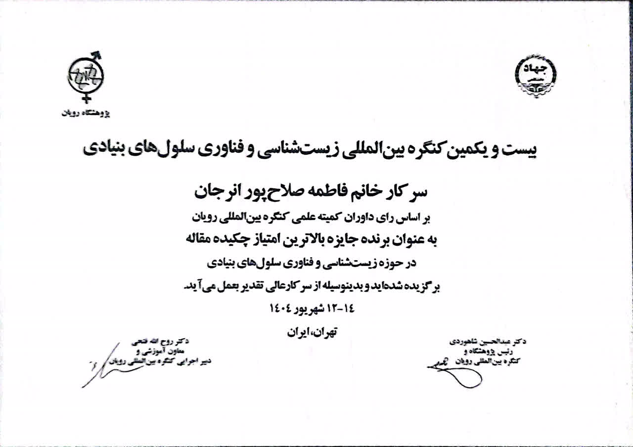 کسب جایزه بالاترین امتیاز چکیده مقاله در کنگره بین المللی زیست شناسی و فناوری سلولهای بنیادی