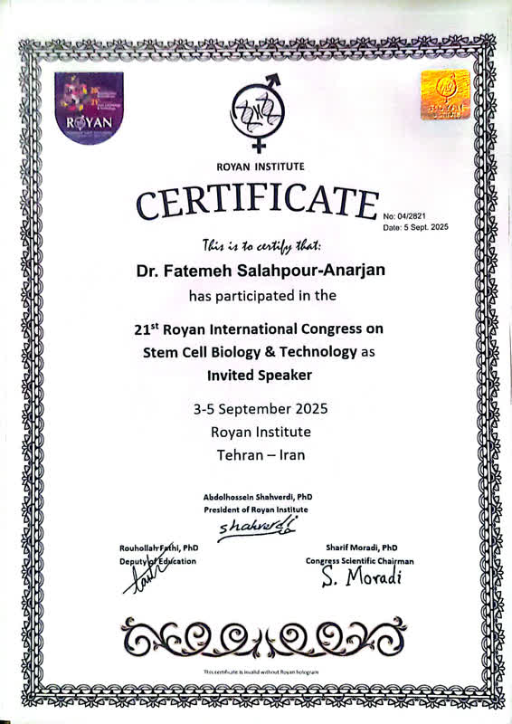 موفقیت سرکارعالی را در کسب جایزه بالاترین امتیاز چکیده مقاله در حوزه زیست شناسی و فناوری سلولهای بنیادی در بیست و یکمین کنگره بین المللی زیست شناسی و فناوری سلولهای بنیادی را تبریک و تهنیت عرض نموده و توفیقات روزافزون شما را از درگاه خداوند متعال خواهانیم.