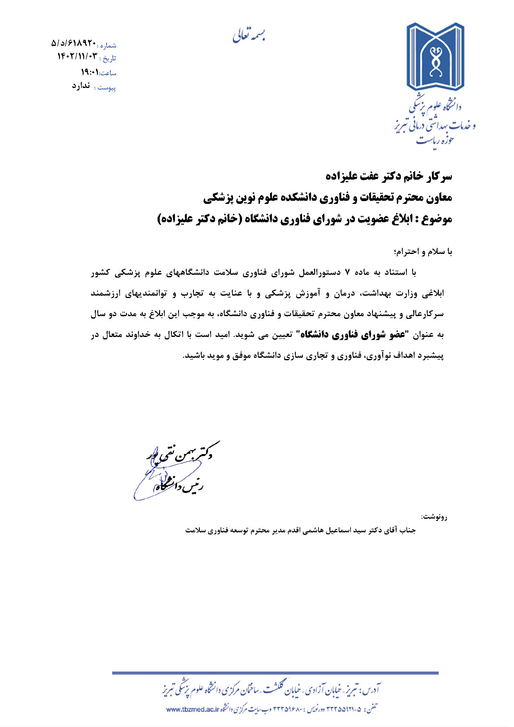 تبریک عضویت در شورای فناوری دانشگاه سرکار خانم دکتر عفت علیزاده کد خبر : 58805 کپی کلمات کلیدی : ابلاغ شورای فناوری دانشگاه دکتر عفت علیزاده