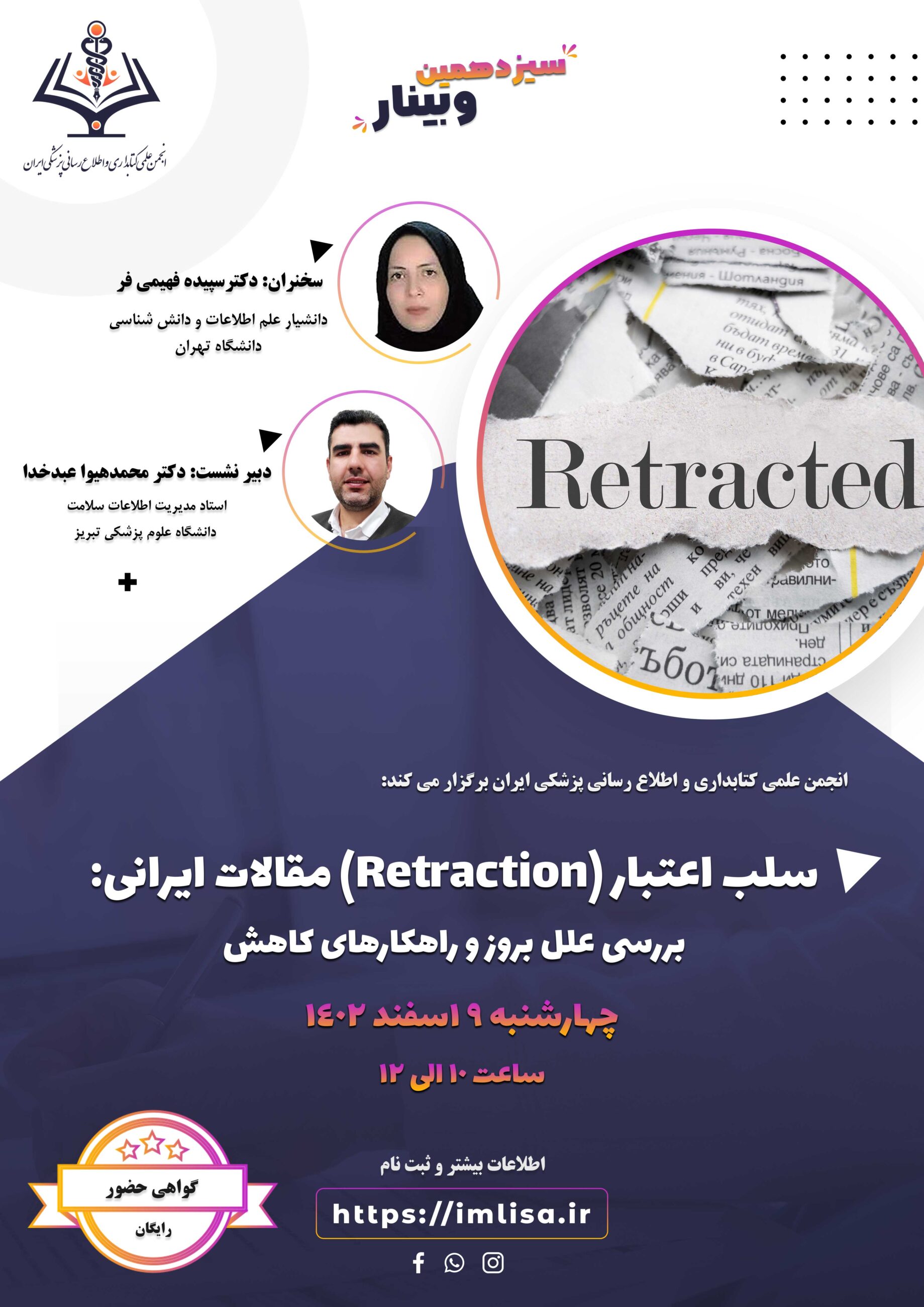 وبینار سلب اعتبار (Retraction) مقالات ایرانی: بررسی علل بروز و راهکارهای کاهش چهارشنبه 9 اسفند کد خبر : 58814 کپی کلمات کلیدی : مقاله پذیرش مقالات اطلاع رسانی وبینار