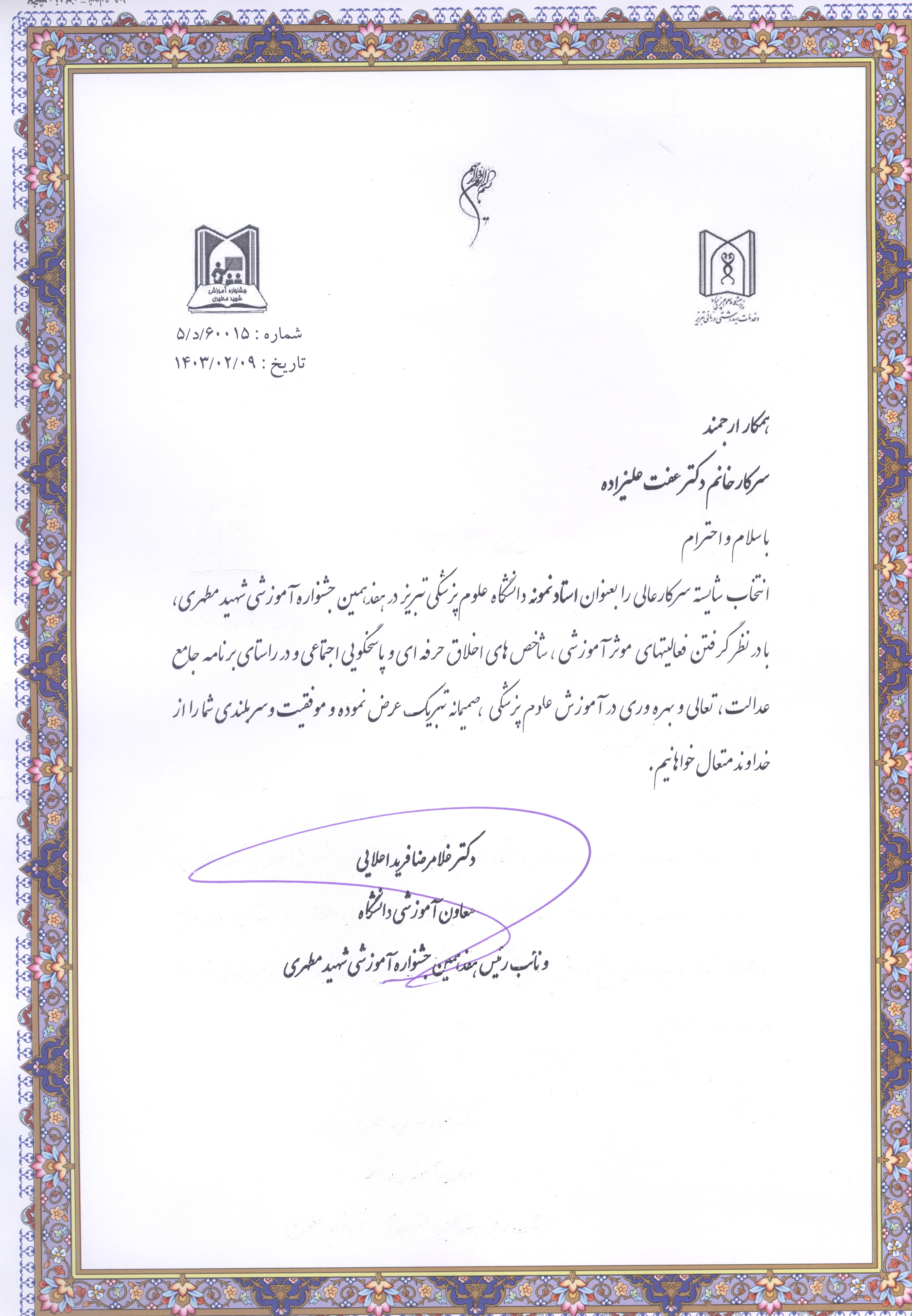 بعنوان استاد نمونه دانشگاه علوم پزشکی تبریز در هفدهمین جشنواره آموزشی شهید مطهری