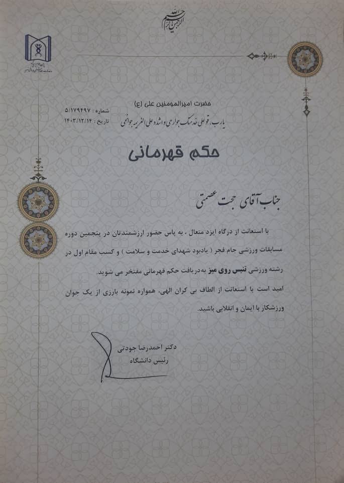 تبریک کسب مقام اول و حکم قهرمانی