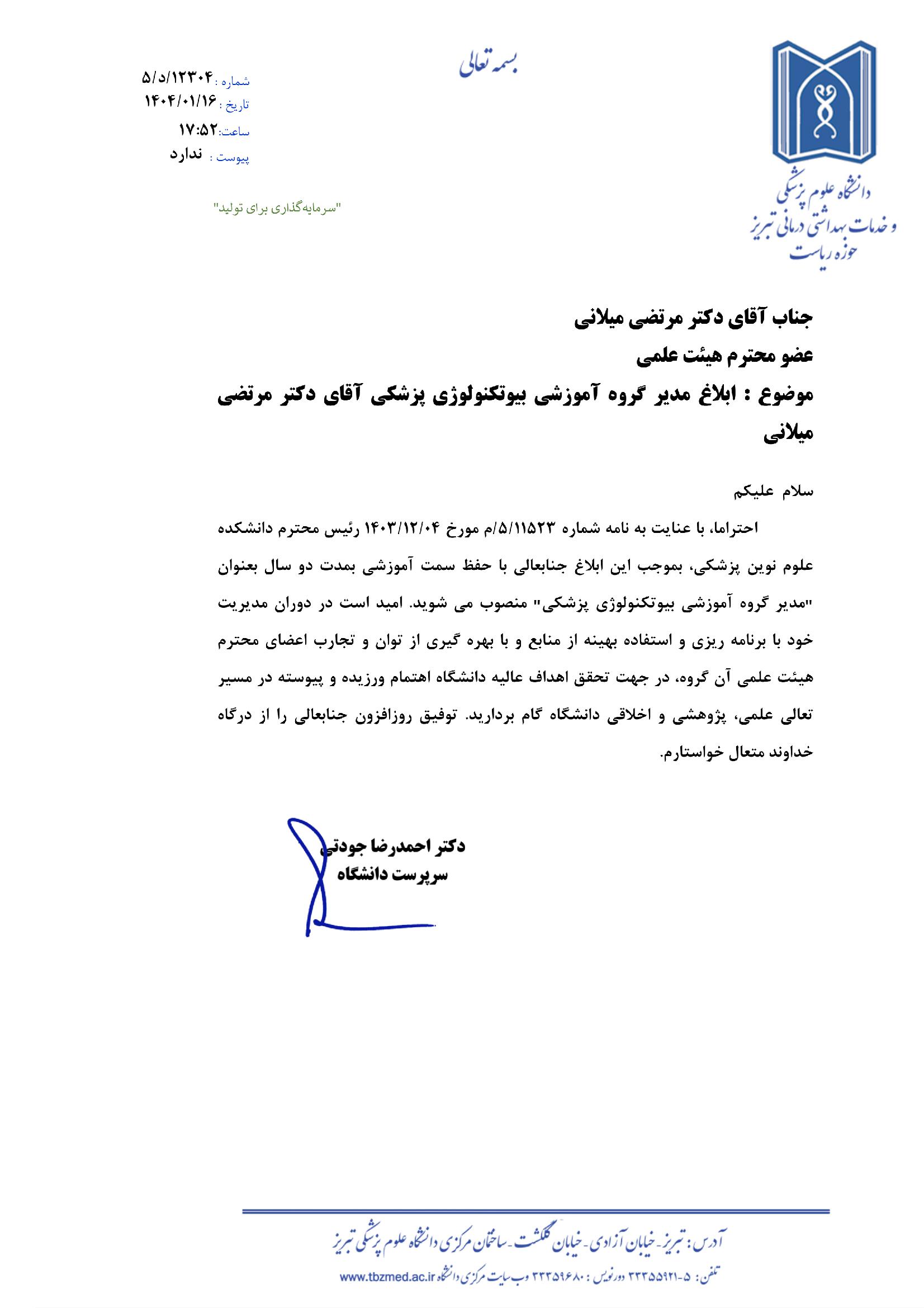 ابلاغ مدیر گروه آموزشی بیوتکنولوژی پزشکی جناب آقای دکتر مرتضی میلانی کد خبر : 58903 کپی کلمات کلیدی : تبریک انتصاب مدیر گروه