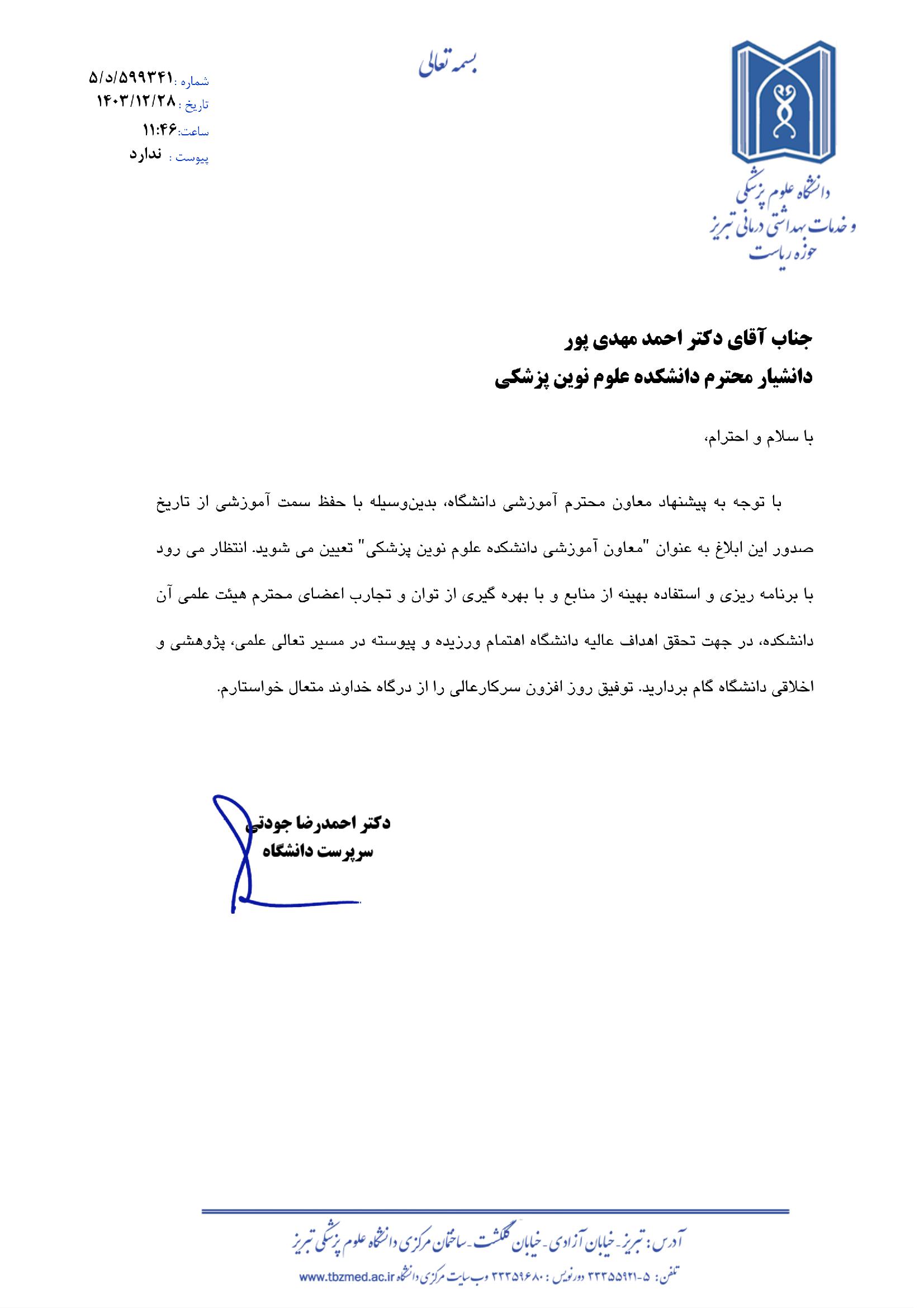 ابلاغ معاونت آموزشی دانشکده علوم نوین پزشکی جناب آقای دکتر احمد مهدی پور کد خبر : 58904 کپی کلمات کلیدی : ابلاغ معاونت آموزشی تبریک انتصاب