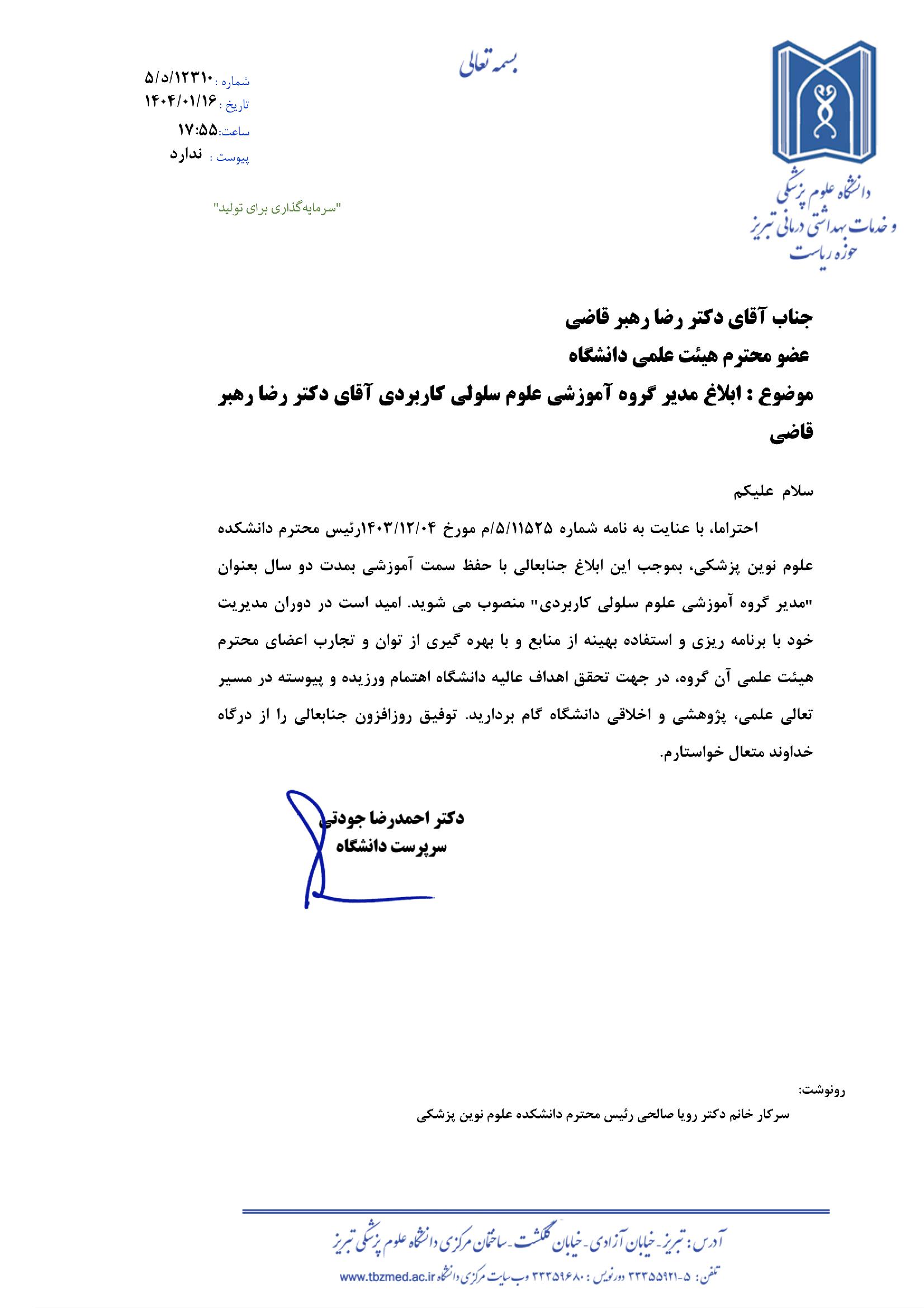 ابلاغ مدیر گروه آموزشی علوم سلولی کاربردی جناب آقای دکتر رضا رهبر قاضی کد خبر : 58907 کپی کلمات کلیدی : انتصاب مدیر گروه تبریک انتصاب