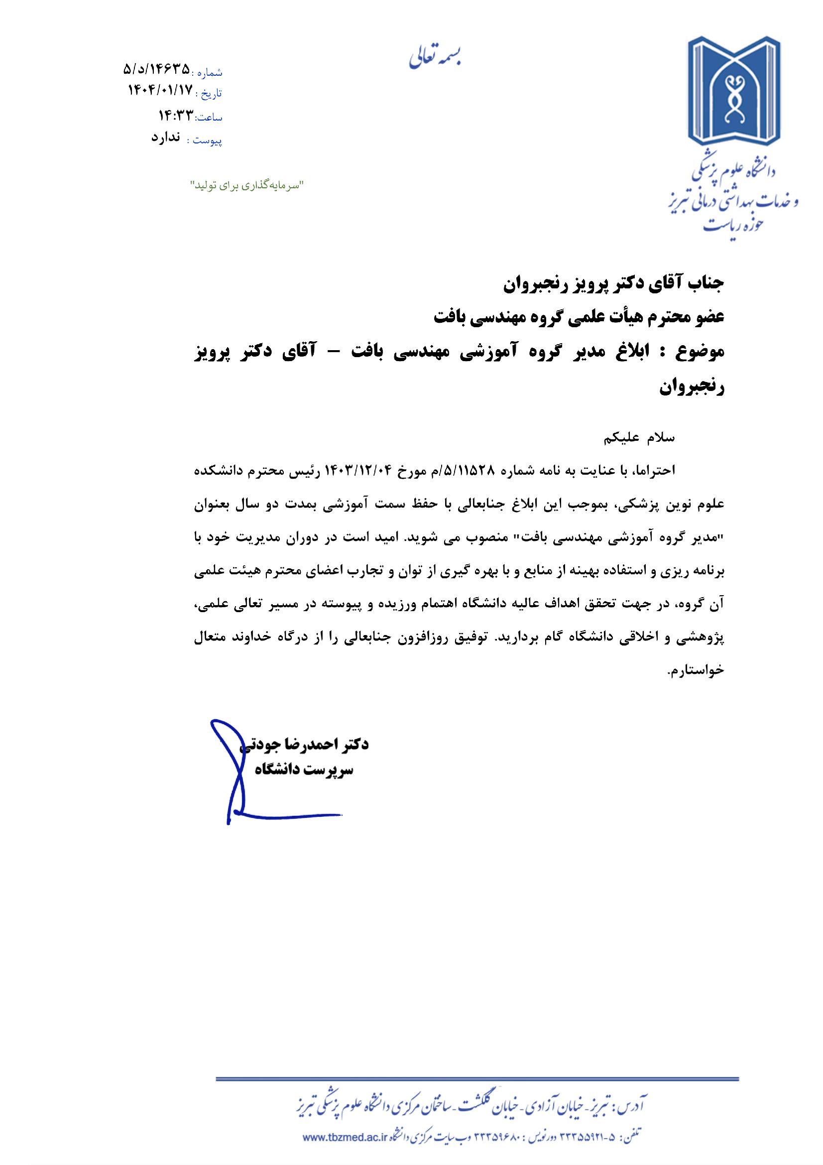 ابلاغ مدیر گروه آموزشی مهندسی بافت جناب آقای دکتر پرویز رنجبروان کد خبر : 58909 کپی کلمات کلیدی : مدیر گروه انتصاب مدیر گروه گروه مهندسی بافت