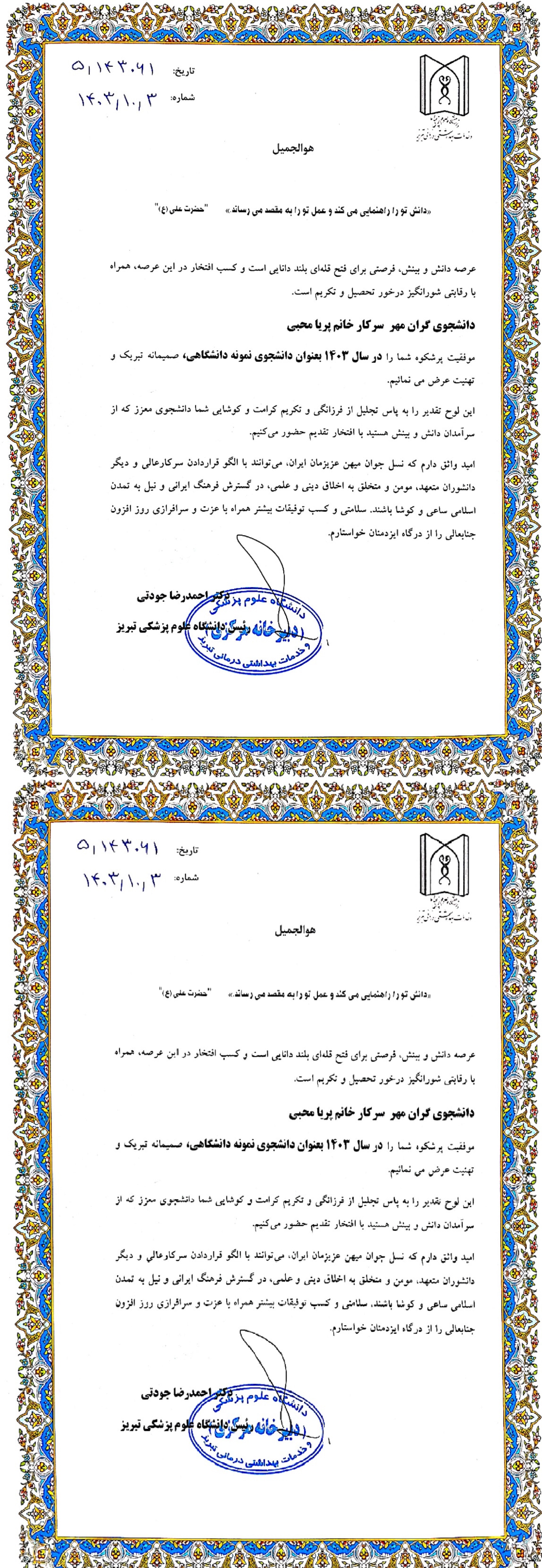 موفقیت پرشکوه سرکار خانم دکتر پریناز نژاد مختاری فارغالتحصیل دکتری تخصصی رشته نانوفناوری پزشکی و سرکار خانم پریا محبی دانشجویان کارشناسی ارشد رشته نانوفناوری پزشکی را بعنوان انتخاب دانشجویان نمونه دانشگاهی در سال ۱۴۰۳ صمیمانه تبریک و تهنیت عرض می نمائیم و از درگاه ایزد منان سلامتی و کسب توفیقات بیشتر همراه با عزت و سرافرازی روزافزون برای این عزیزان خواستاریم.