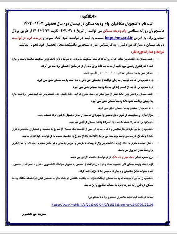 ثبت نام دانشجویان متقاضیان وام ودیعه مسکن در نیمسال دوم سال تحصیلی 1403-1404 . کد خبر : 58918 کپی کلمات کلیدی : صندوق رفاه دانشجویی وام ودیعه مسکن دانشجویان متقاضی وام