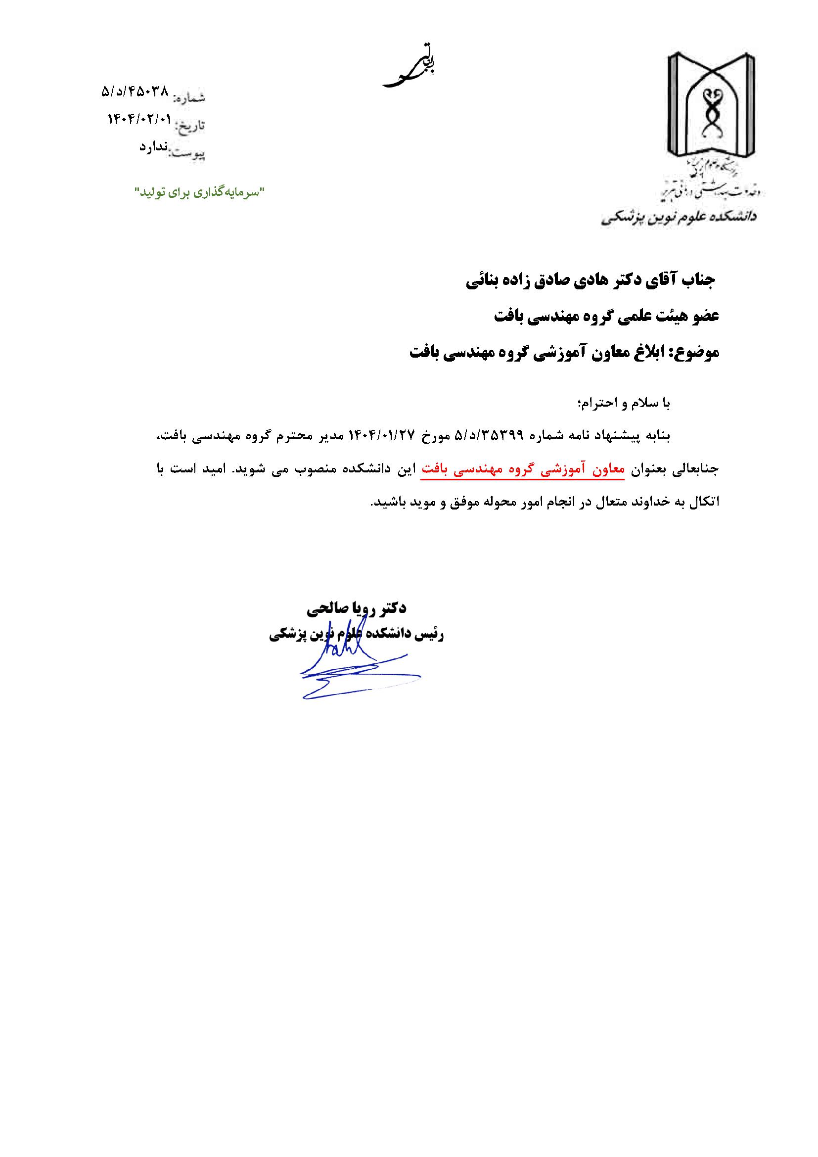 ابلاغ معاون آموزشی گروه مهندسی بافت جناب آقای دکتر هادی صادق زاده بنائی کد خبر : 58924 کپی کلمات کلیدی : ابلاغ معاون آموزشی گروه گروه مهندسی بافت