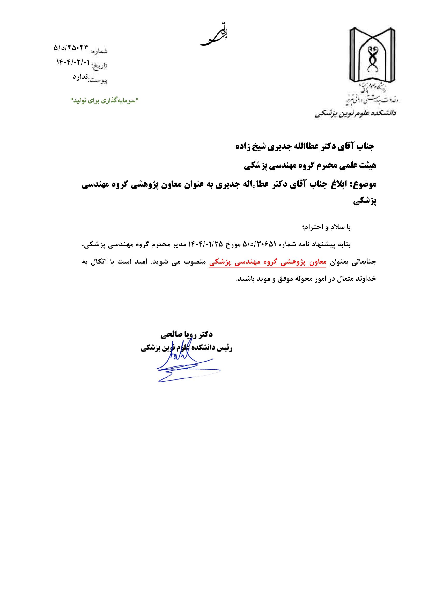ابلاغ معاون پژوهشی گروه مهندسی پزشکی جناب آقای دکتر عطاءاله جدیری کد خبر : 58927 کپی کلمات کلیدی : ابلاغ گروه مهندسی پزشکی ابلاغ معاون پژوهشی