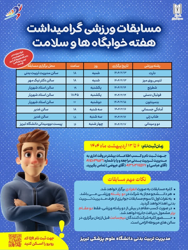 از کلیه دانشجویان ورزشکار دعوت می گردد، جهت حضور در مسابقات هفته خوابگاهها و پانزدهمین المپیاد ورزشی دانشجویان دانشگاههای علوم پزشکی کشور، تا تاریخ 1404/02/13 به لینکهای موجود در کانال مفدا یا مدیریت تربیت بدنی دانشگاه مراجعه نمایند.