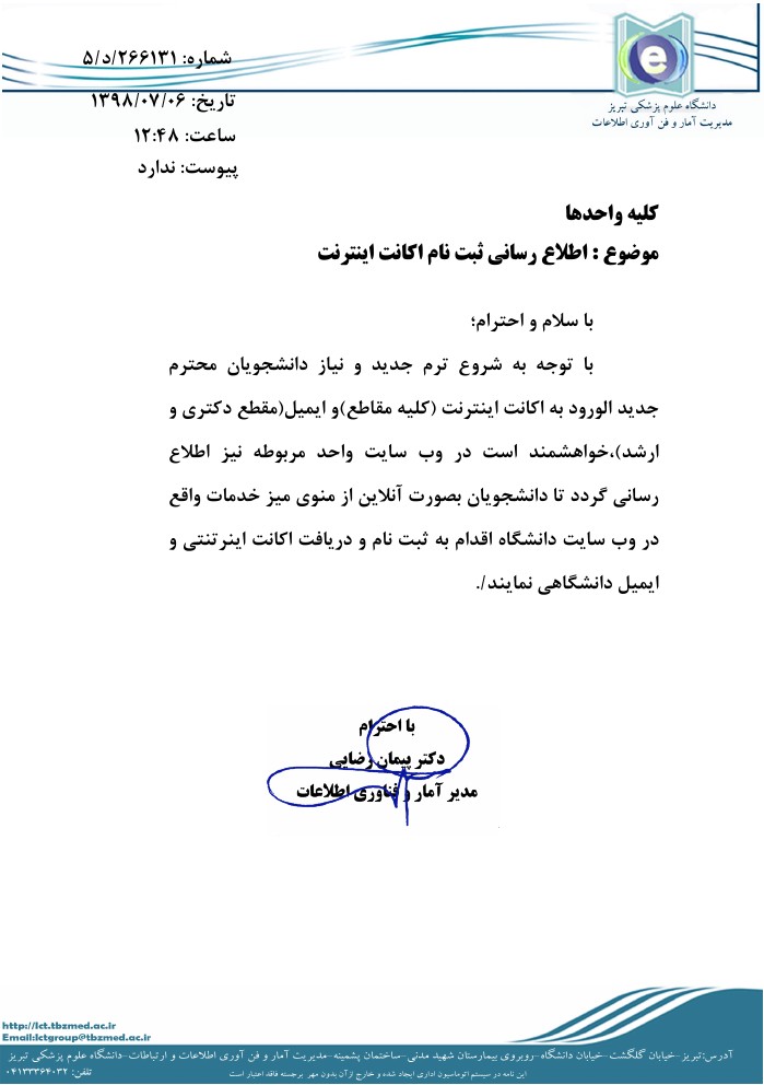 طبق نامه مدیر محترم آمار و فناوری اطلاعات دانشگاه˓ واحد انفورماتیک دانشکده هیچگونه مسئولیتی در قبال اکانت اینترنت و ایمیل دانشگاه ندارد. ثبت نام فقط به صورت آنلاین و همچنین در وب سایت دانشکده˓ منوی میز خدمت قسمت انفورماتیک نیز قابل دسترس می باشد. در صورت بروز هرگونه مشکل با شماره تلفن 04131771015 تماس حاصل فرمایید.