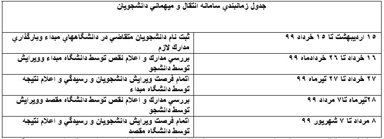 یه اطلاع آن دسته از دانشجویان متقاضی می رساند سامانه انتقال و میهمانی دانشجویان دانشگاههای علوم پزشکی جهت نیمسال اول 1400-1399 براساس جدول ذیل فعال خواهد گردید. ضمن آنکه به اطلاع می رساند با توجه به ممنوعیت انتقال دانشجویان مقاطع تحصیلات تکمیلی،تصمیم گیری در خصوص انتقال این دانشجویان طبق سنوات گذشته در کمیسیون موارد خاص انتقال دانشجویان مقاطع کارشناسی ارشد و دکتری تخصصی در مرداد یا شهریور ماه سال 99 انجام خواهد شد.