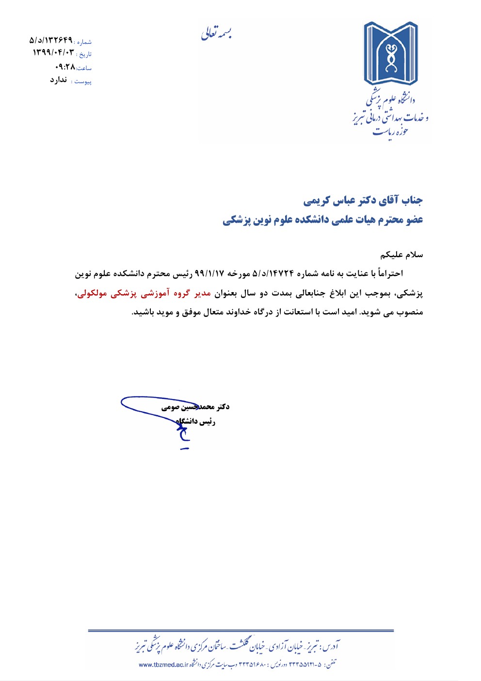 تبریک و تهنیت انتصاب مدیر گروه پزشکی مولکولی جناب آقای دکتر عباس کریمی انتصاب جنابعالی به سمت مدیر گروه آموزشی پزشکی مولکولی را خدمت شما و اعضای محترم هیات علمی تبریک و تهنیت عرض مینماییم و موفقیت روزافزون شما را از خداوند منان خواستاریم. کد خبر : 58392 کپی کلمات کلیدی : پزشکی مولکولی حکم انتصاب دکتر عباس کریمی