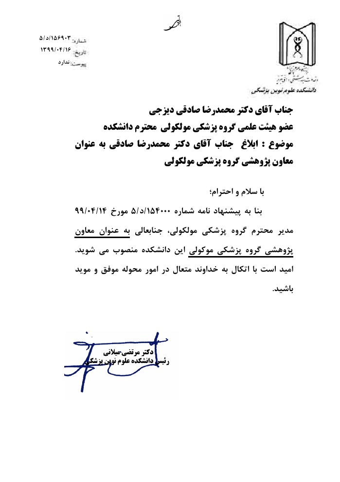 تبریک انتصاب آقای دکتر محمد رضا صادقی کد خبر : 58396 کپی کلمات کلیدی : ابلاغ معاون پژوهشی گروه پزشکی مولکولی