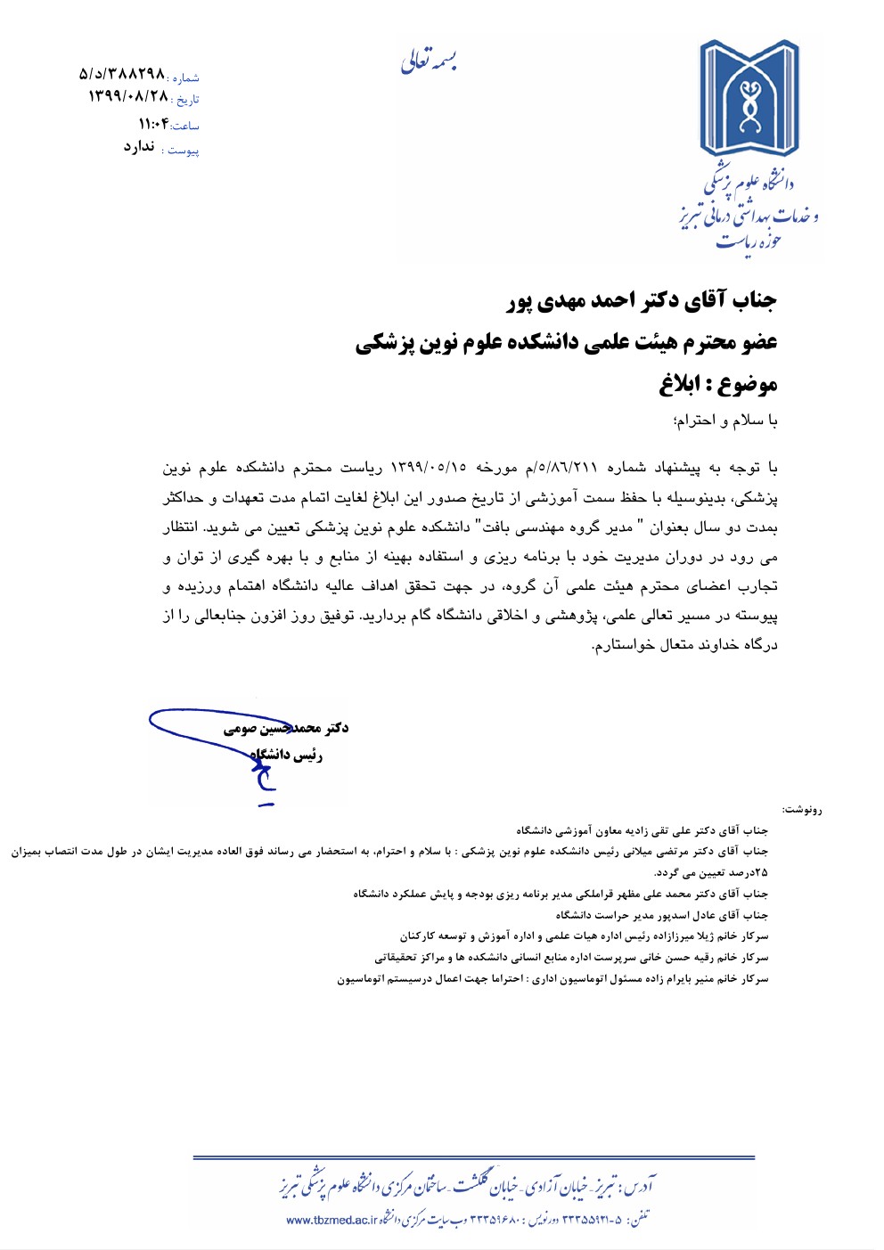 انتصاب جنابعالی را به سمت مدیر گروه مهندسی بافت خدمت شما تبریک عرض نموده و از خداوند منان توفیقات روز افزون شما را خواستاریم.