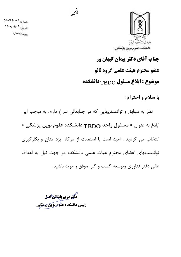 انتصاب مسؤل TBDO دانشکده علوم نوین پزشکی ... کد خبر : 58508 کپی کلمات کلیدی : دانشکده علوم نوین پزشکی دکتر کیهان ور TBDO