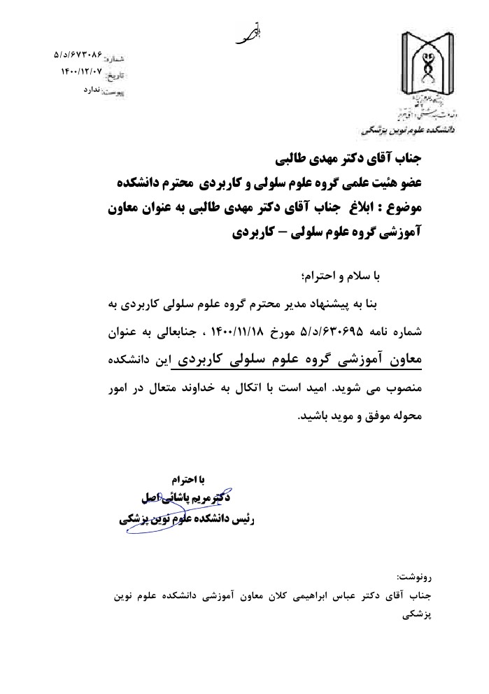 ابلاغ دکتر مهدی طالبی بعنوان معاون آموزشی گروه علوم سلولی و کاربردی کد خبر : 58524 کپی کلمات کلیدی : معاون آموزشی ابلاغ مسئولیت علوم سلولی وکاربردی