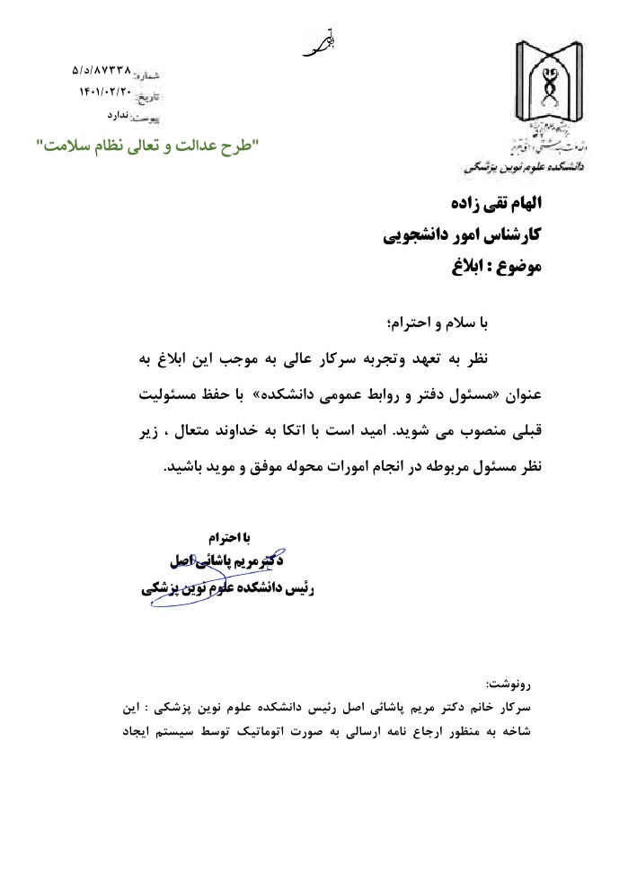 ابلاغ مسئول جدید دفتر ریاست دانشکده . کد خبر : 58530 کپی کلمات کلیدی : ابلاغ دانشکده علوم نوین پزشکی مسئول دفتر ریاست