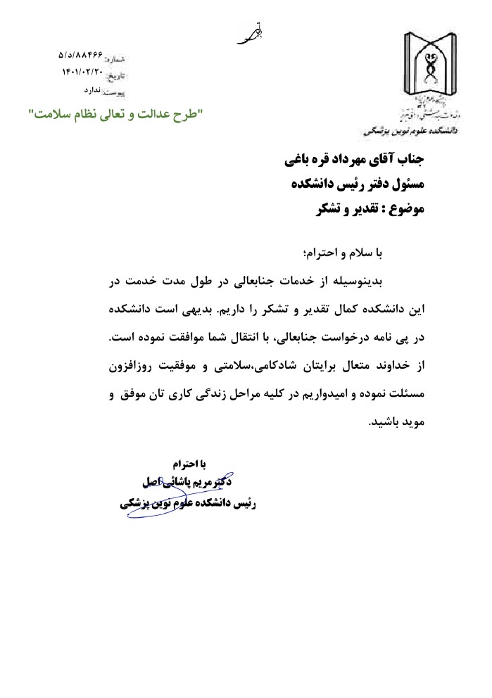 تقدیر و تشکر از جناب آقای مهداد قره باغی کد خبر : 58531 کپی کلمات کلیدی : انتصاب دانشکده علوم نوین پزشکی تقدیر و تشکر