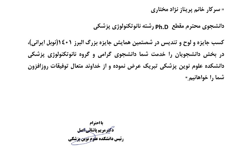 پیام تبریک ریاست محترم دانشکده در پی کسب جایزه شصتمین همایش جایزه بزرگ البرز 1401 خانم پریناز نژادمختاری