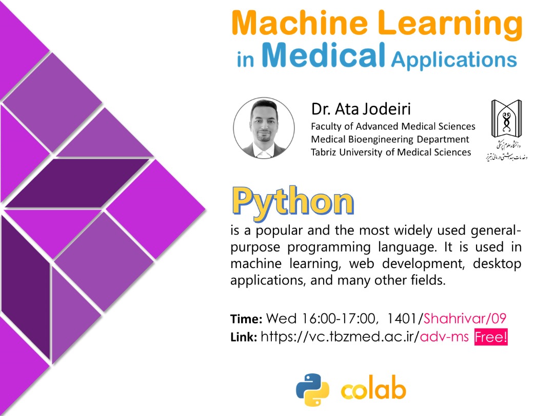 باتوجه به اهمیت روزافزون هوش مصنوعی در پزشکی و نیاز به آشنایی جامعه محققان پزشکی با روشهای نوین هوش مصنوعی در طیف وسیعی از کاربردهای حوزه سلامت، دانشگاه علوم پزشکی تبریز مجموعه وبینارهای آموزشی تحت عنوان یادگیری ماشین در کاربردهای پزشکی را توسط جناب آقای دکتر عطا جدیری عضو محترم هیئت علمی گروه آموزشی مهندسی پزشکی دانشکده علوم نوین پزشکی برگزار مینماید. در هریک از این وبینارها یک زیرمجموعه از روشهای هوش مصنوعی برای حل یک مسئله پزشکی به همراه آموزش کدنویسی پروژهمحور در زبان برنامهنویسی پایتون ارائه خواهد شد.