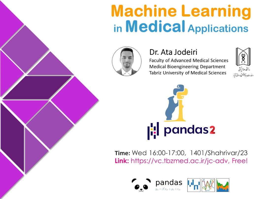 وبینار چهارم دوره یادگیری ماشین در کاربرد پزشکی با هدف آموزش تکمیلی کتابخانه پانداس در زبان برنامهنویسی پایتون در مورخه 23 شهریور از ساعت ۱۶ الی ۱۷ برگزار خواهد شد.