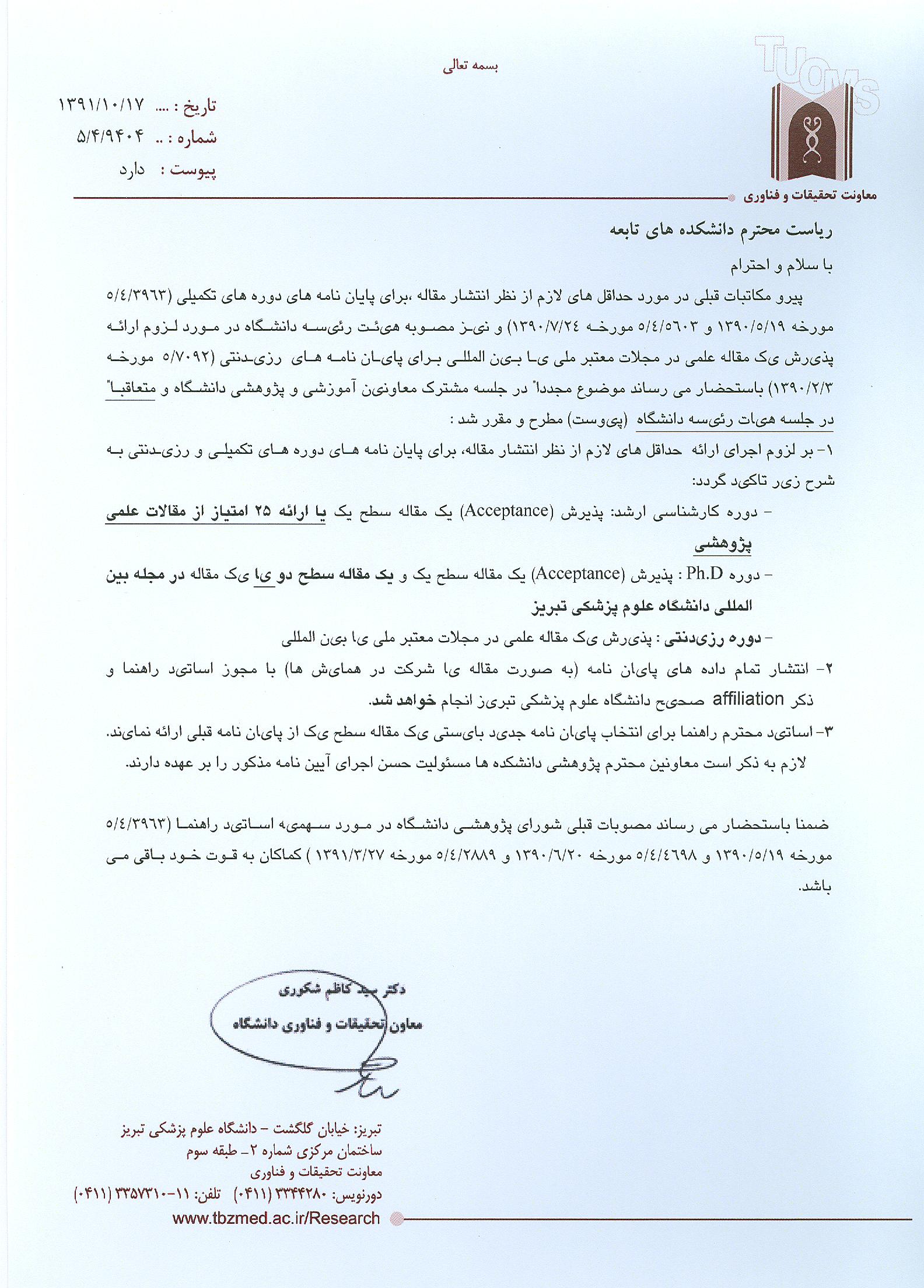 حداقل های لازم از نظر انتشار مقاله برای پایان نامه های دوره های تکمیلی...