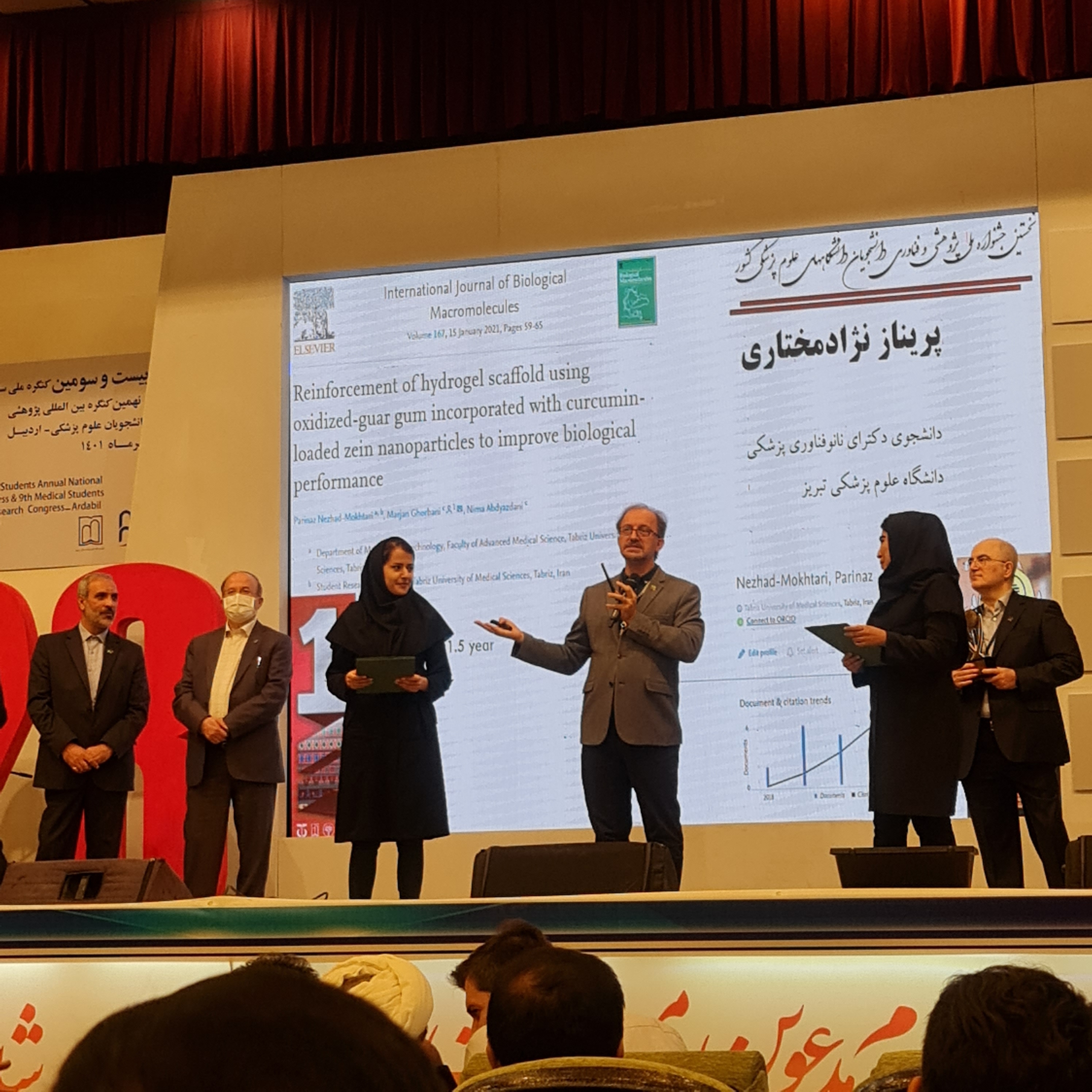 به گزارش روابط عمومی دانشکده علوم نوین پزشکی به نقل از کمیته تحقیقات دانشجویی،دانشجویان دانشگاه علوم پزشکی تبریز در بیست و سومین کنگره ملی سالیانه و نهمین همایش بینالمللی پژوهشی دانشجویان علوم پزشکی سراسر کشور که با حضور معاون تحقیقات وفناوری وزارت بهداشت در ۸ مهرماه ۱۴۰۱ در شهر اردبيل برگزار شد، موفق به کسب رتبه های برتر شدند که در این میان مقاله خانم پریناز نژاد مختاری نیز به عنوان مقاله برگزیده و برتر دانشجویی سال انتخاب گردیده و ایشان موفق به دریافت لوح تقدیر و تندیس جشنواره شدند.