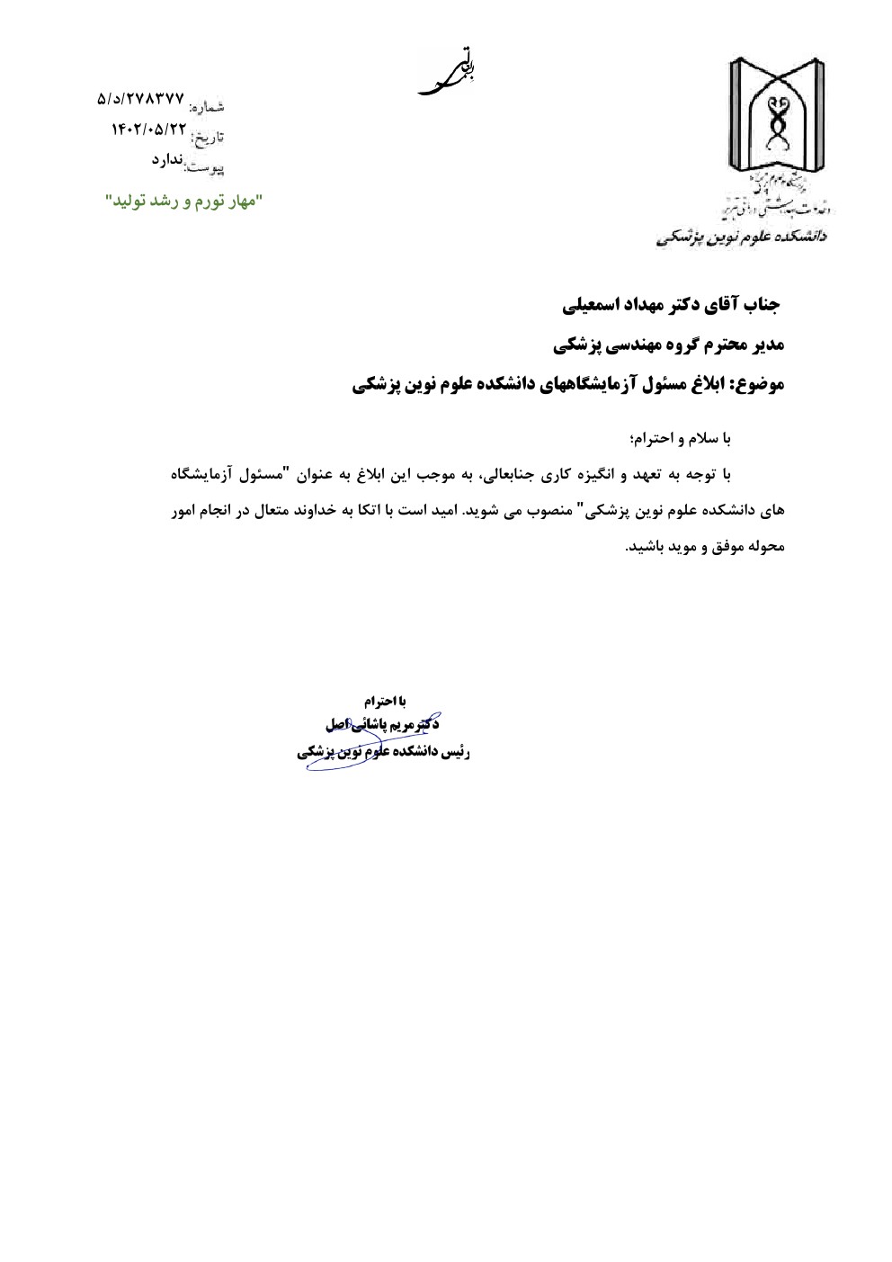 ابلاغ مسئول آزمایشگاههای دانشکده علوم نوین پزشکی . کد خبر : 58716 کپی کلمات کلیدی : ابلاغ حکم ابلاغ مسئولیت مسئول آزمایشگاه