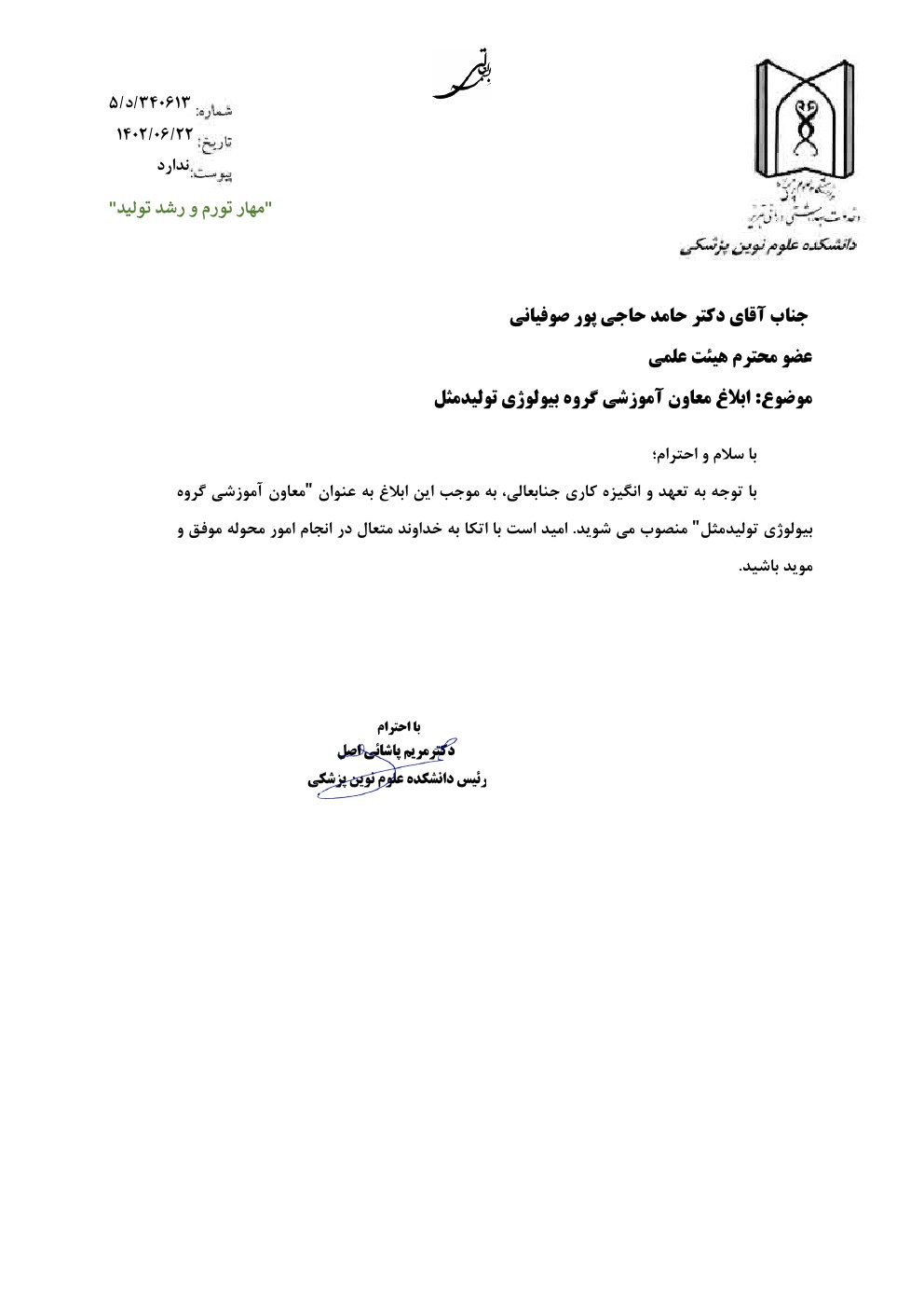 ابلاغ معاون آموزشی گروه بیولوژی تولید مثل . کد خبر : 58732 کپی کلمات کلیدی : ابلاغ بیولوژی تولید مثل دکتر حاجی پور