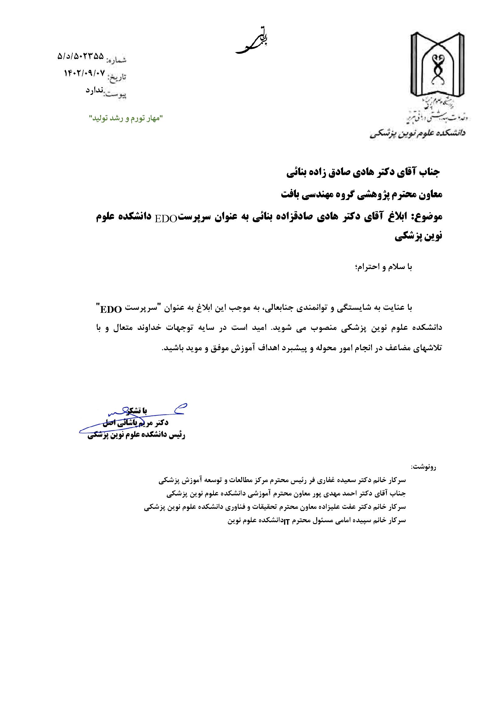 ابلاغ سرپرست جدید EDO دانشکده . کد خبر : 58774 کپی کلمات کلیدی : دانشگاه علوم پزشکی تبریز سرپرست جدید EDO