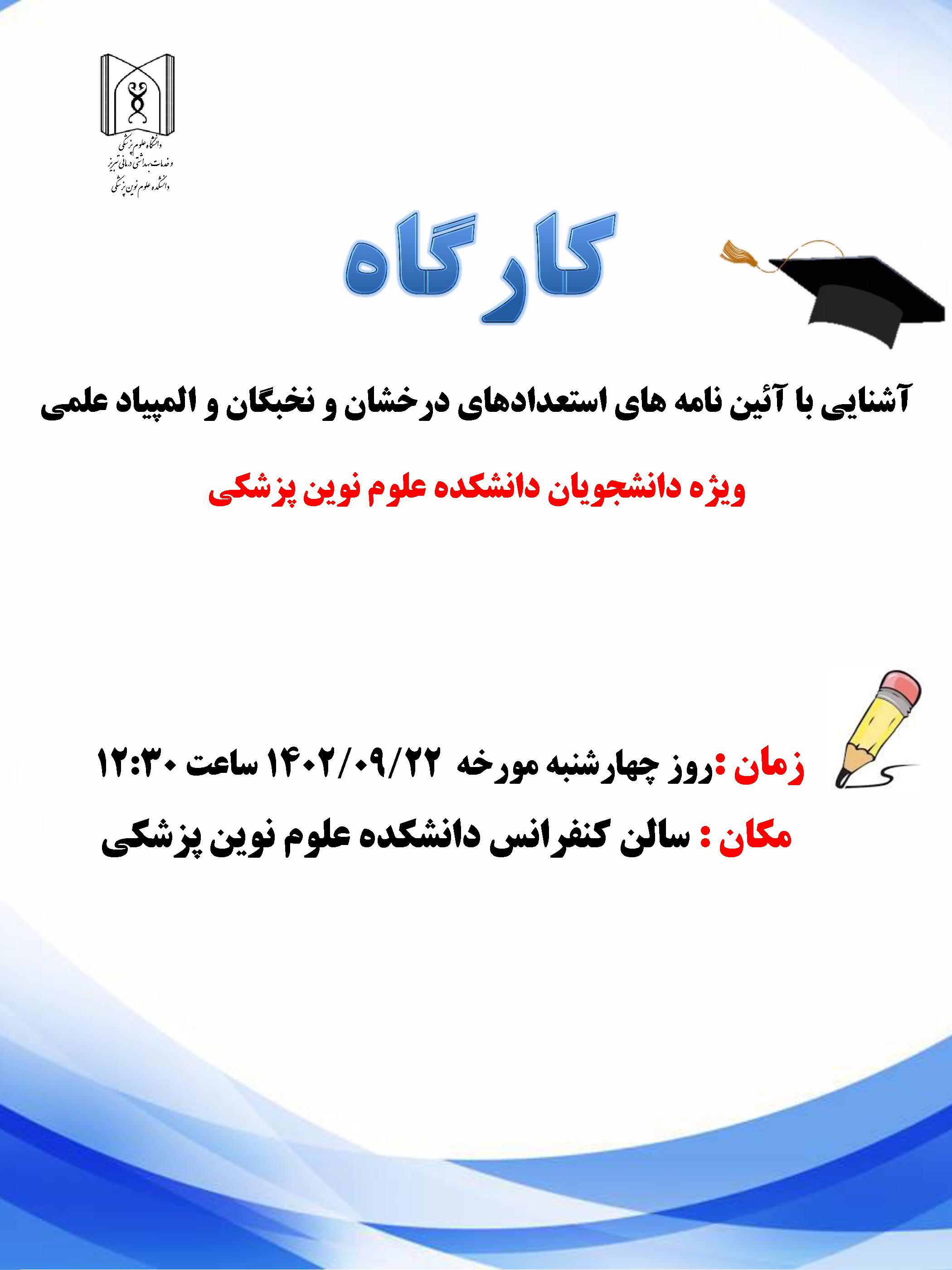 کارگاه ویژه دانشجویان علوم نوین پزشکی . کد خبر : 58778 کپی کلمات کلیدی : المپیاد علمی کارگاه استعدادهاي درخشان