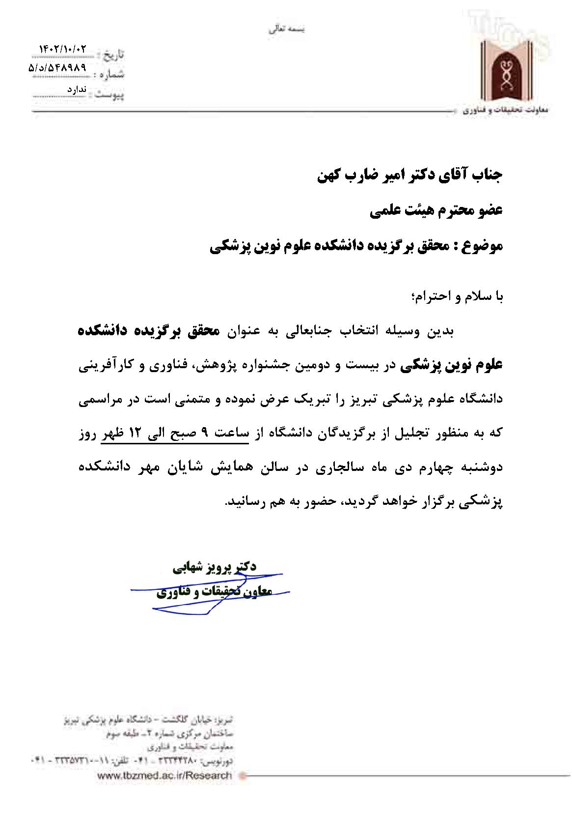 جناب آقای دکتر امیر ضارب کهن انتخاب شایسته جنابعالی به عنوان محقق برگزیده دانشکده علوم نوین پزشکی در بیست و دومین جشنواره پژوهش، فناوری و کارآفرینی دانشگاه علوم پزشکی تبریز را تبریک و تهنیت عرض نموده و از خداوند متعال توفیقات روزافزون شما را خواهانیم.